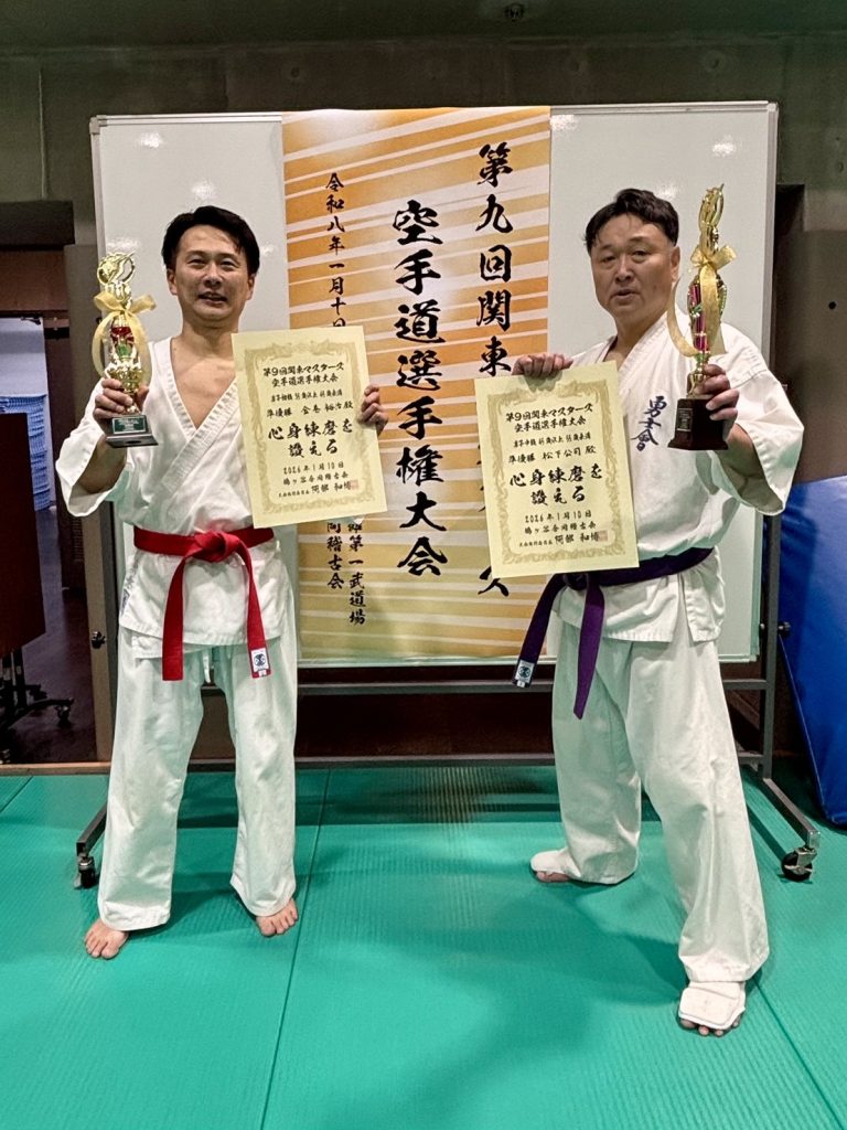 【結果】第9回関東マスターズ空手道選手権大会 投稿日:2026年1月11日 【開催日】 2026年1月10日(土) 【会場】東京武道館第一武道場 【主催】 一般社団法人鳩ヶ谷合同稽古会 <男子初級35歳以上45歳未満> 準優勝 金巻 裕治 (本部道場) <男子中級45歳以上55歳未満> 準優勝 松下 公司 (秋津道場)